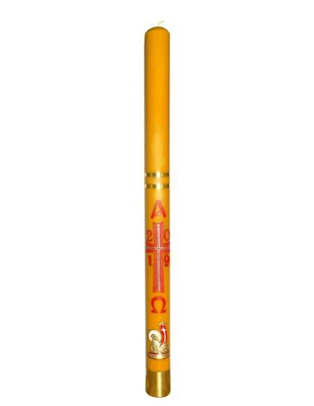 Świeca pakowana jednostkowo. Opakowanie zawiera komplet gron(ziaren, gruszek), a na krzyżu jest nawierconych 5 otworów do ich umieszczenia. Paschał udekorowany jest wypukłymi aplikacjami woskowymi. Dolna opaska jest tuleją mosiężną zwiększającą wytrzymałość mechaniczną jak i nadającą klasyczny wygląd tradycyjnej Świecy Paschalnej. Świeca produkowana jest w kolorze białym, żółtym i woskowym(z dodatkiem naturalnego wosku pszczelego)